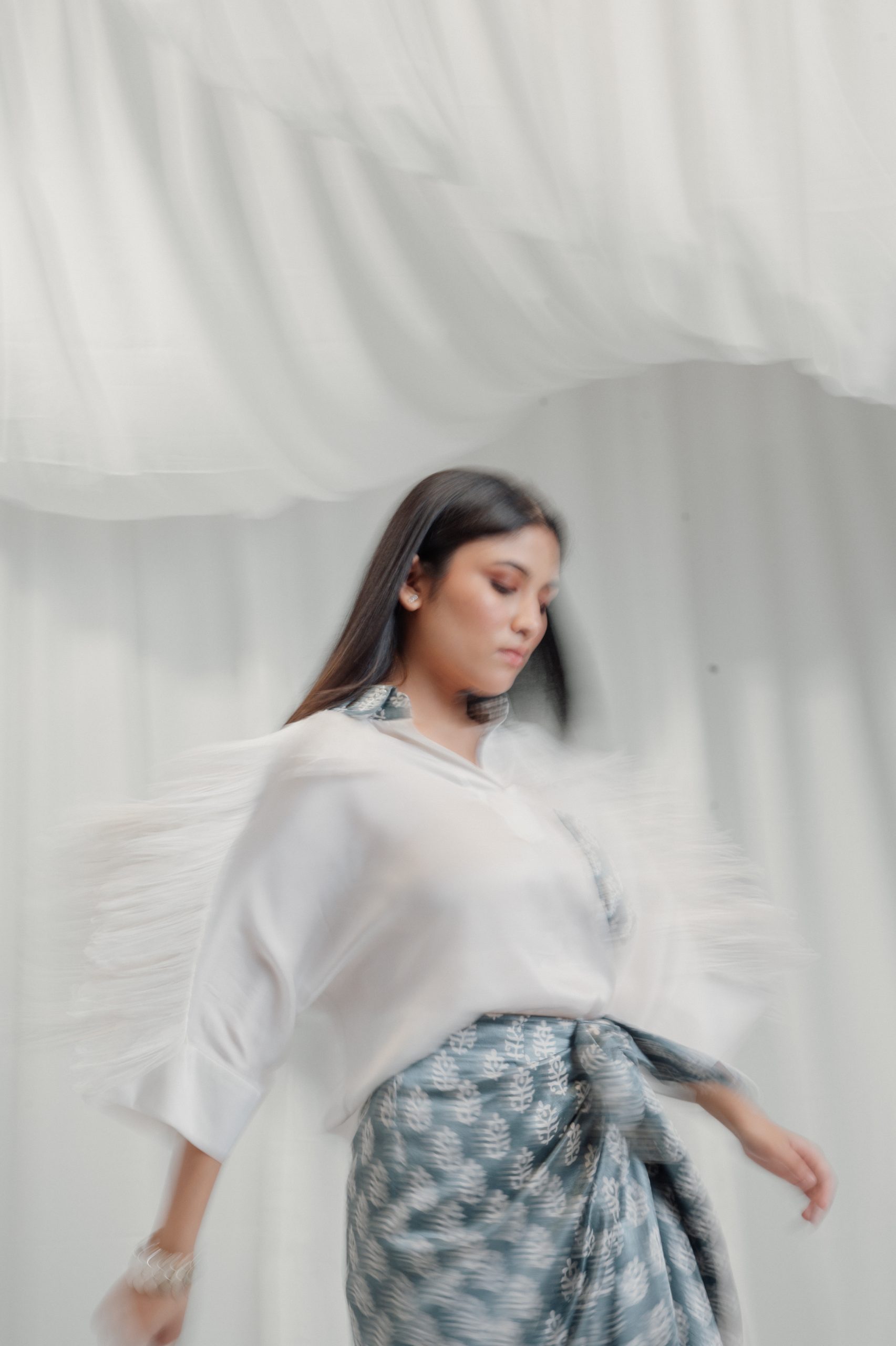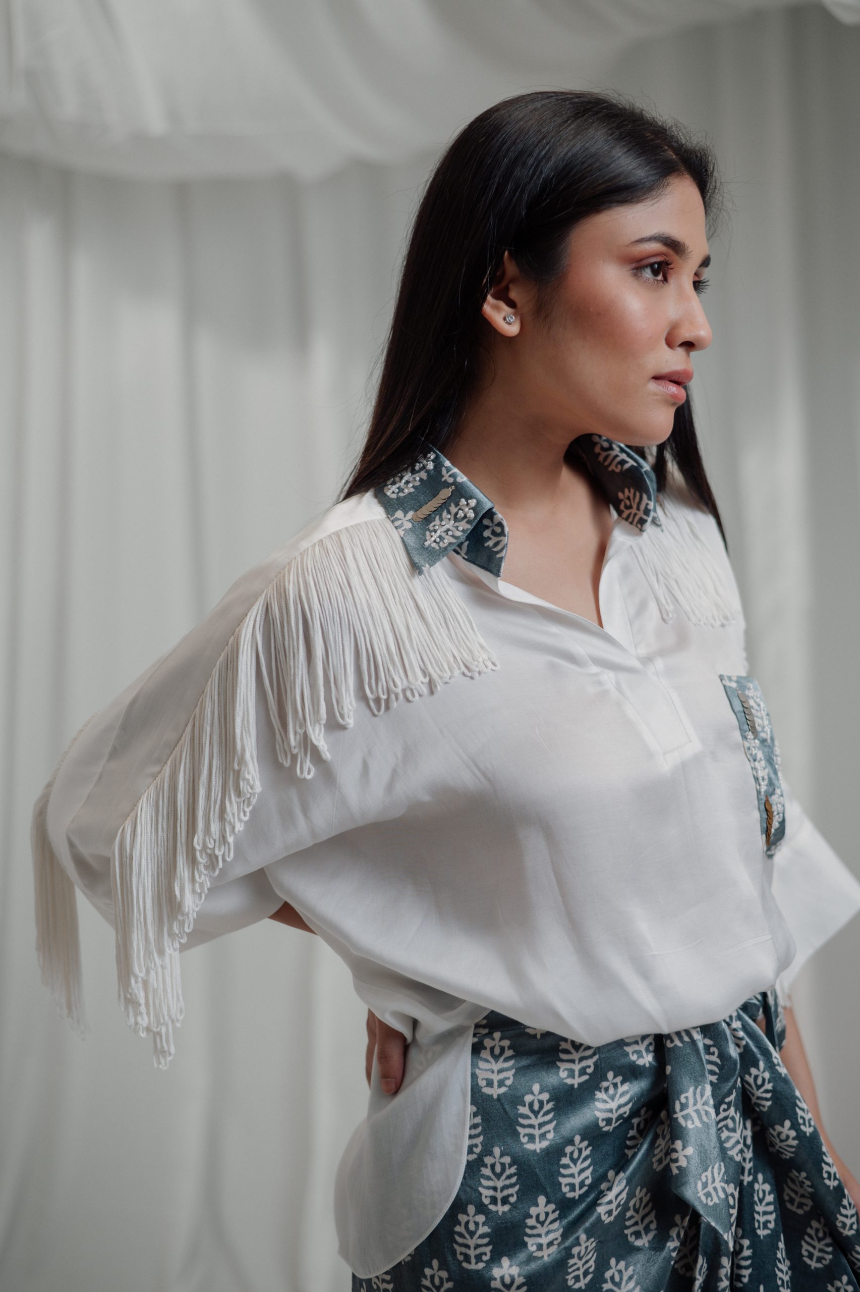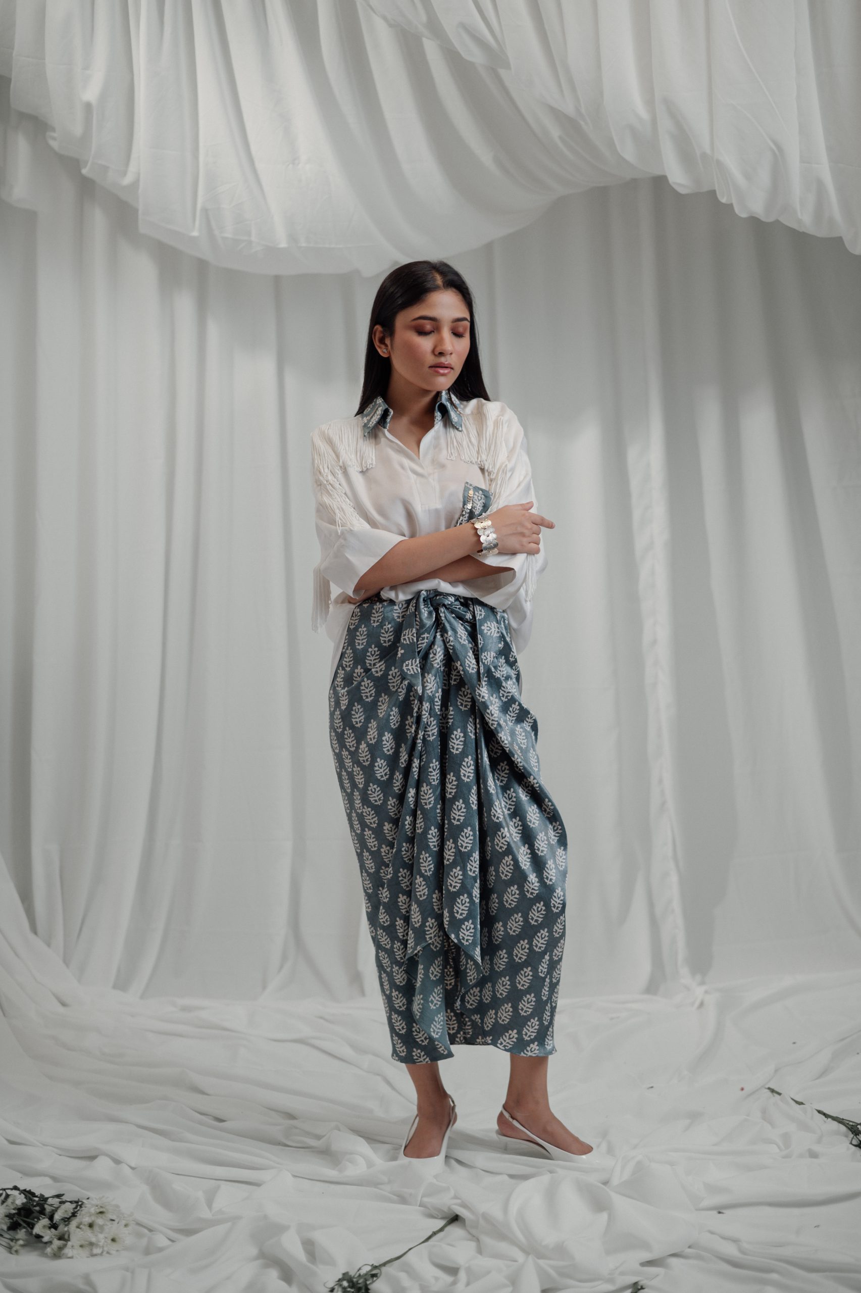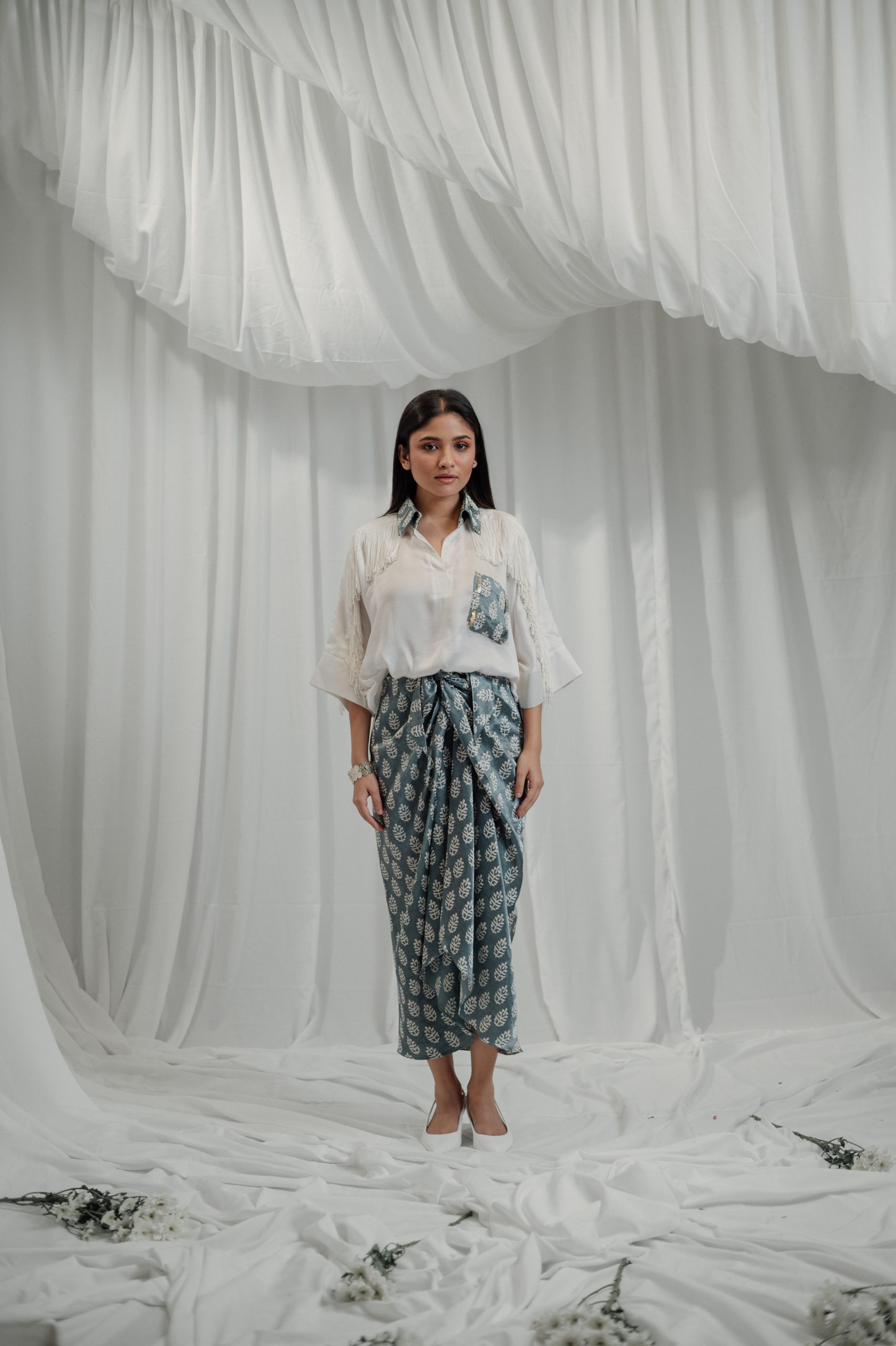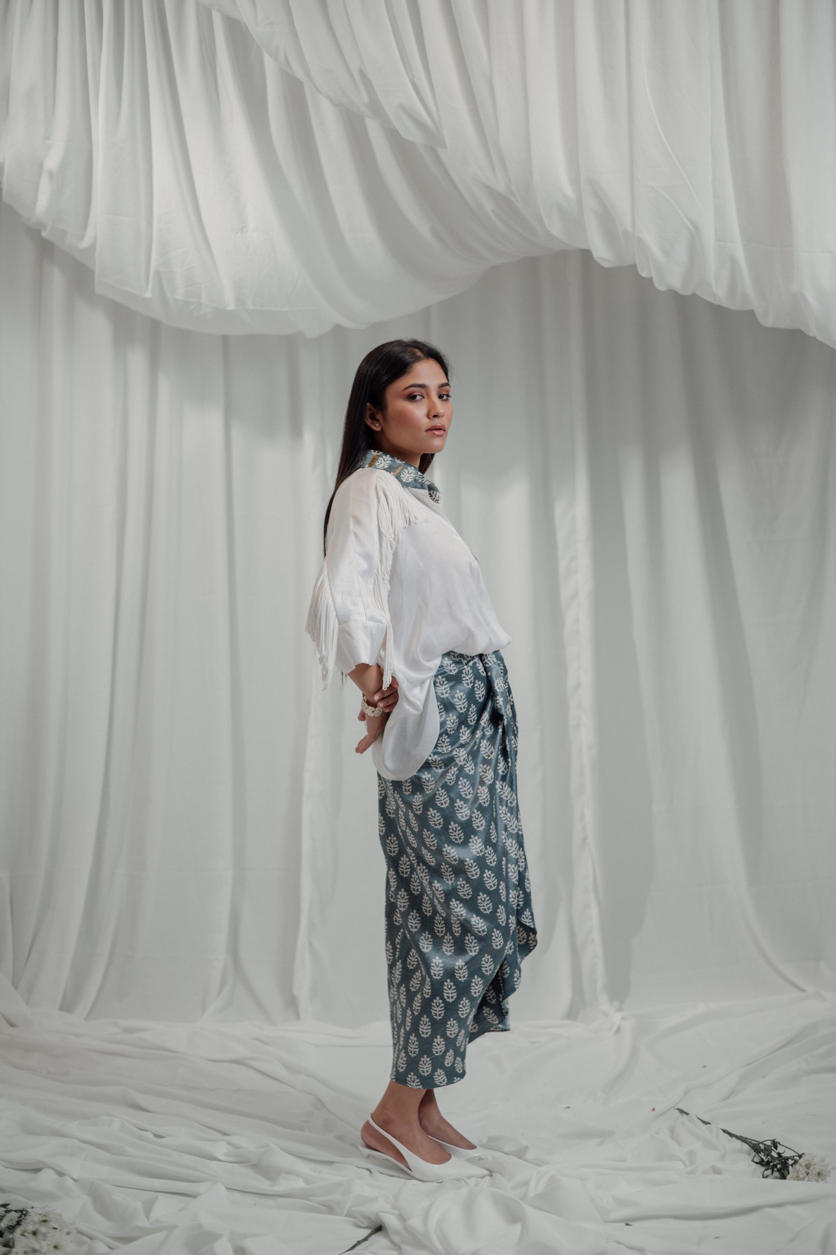 AN ASH GREY MASHRU SKIRT WITH HAND BLOCKED MOTIFS GETS AN URBAN SILHOUTTE WITH A KNOTTED DRAPED SKIRT PAIRED WITH FLIRTY FRINGED WHITE SHIRT WITH A CO-ORDINATED AND EMBELLISHED COLLAR AND POCKET- HANDCRAFTED WITH METAL AND BEADS.