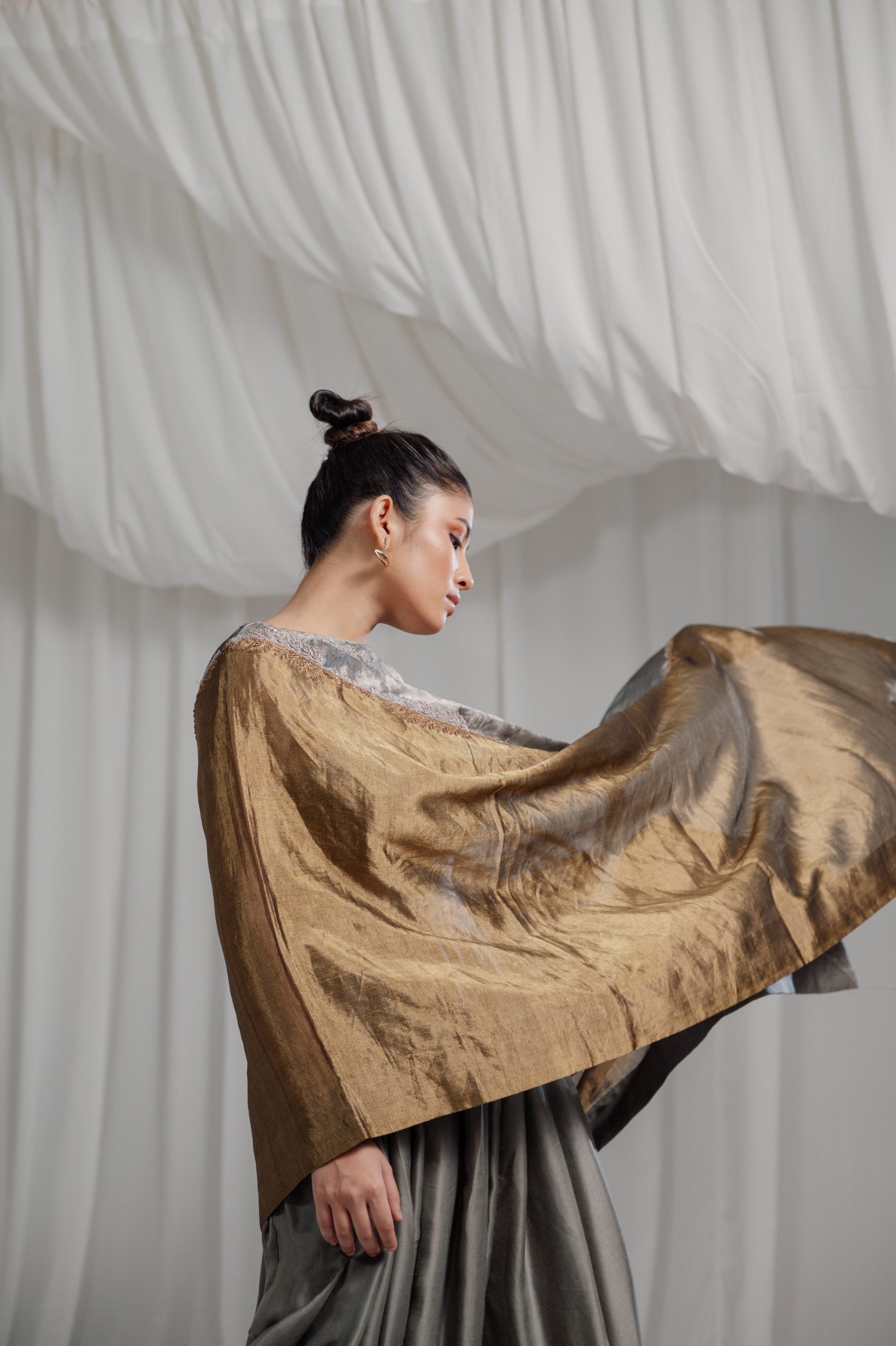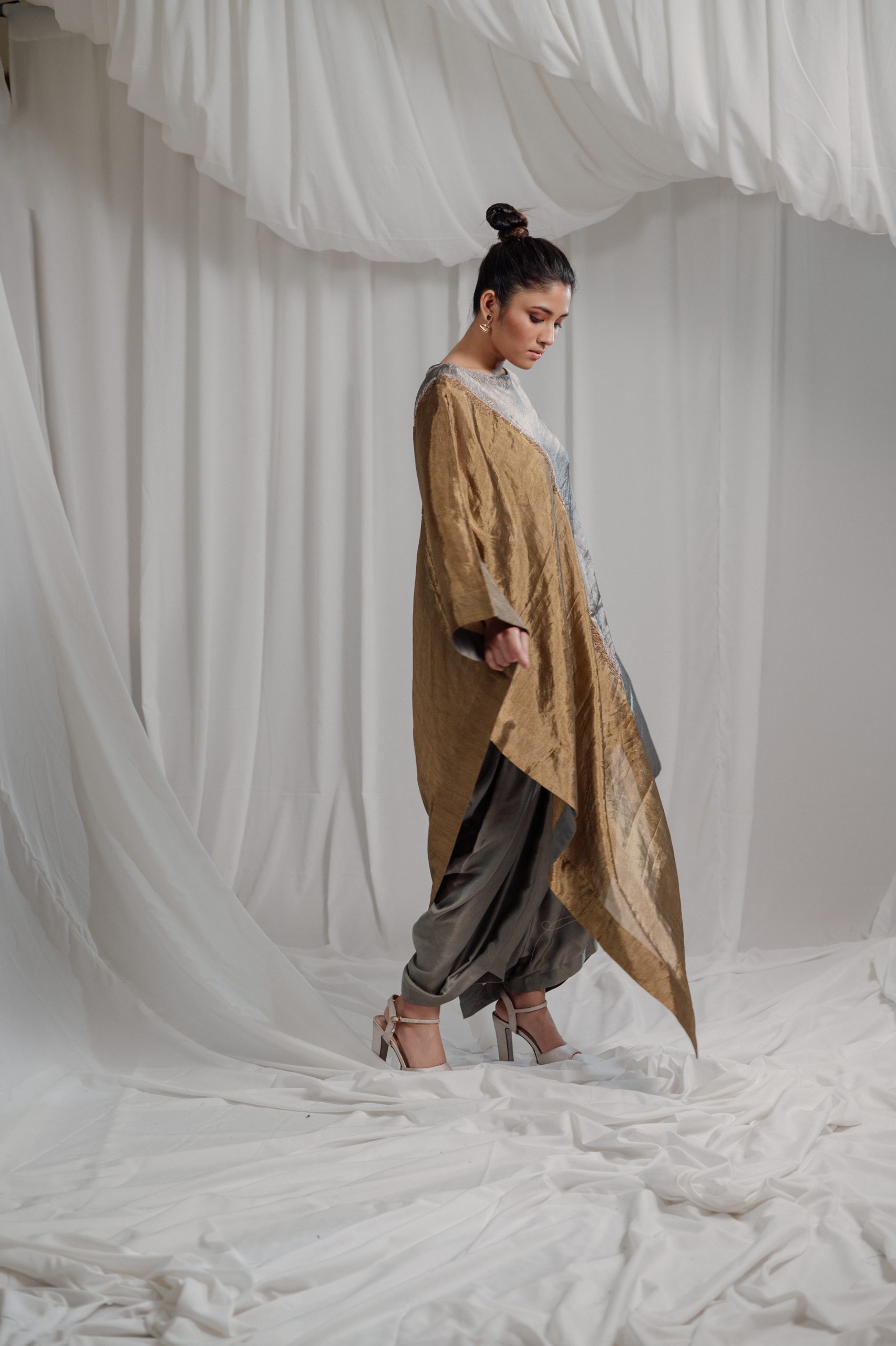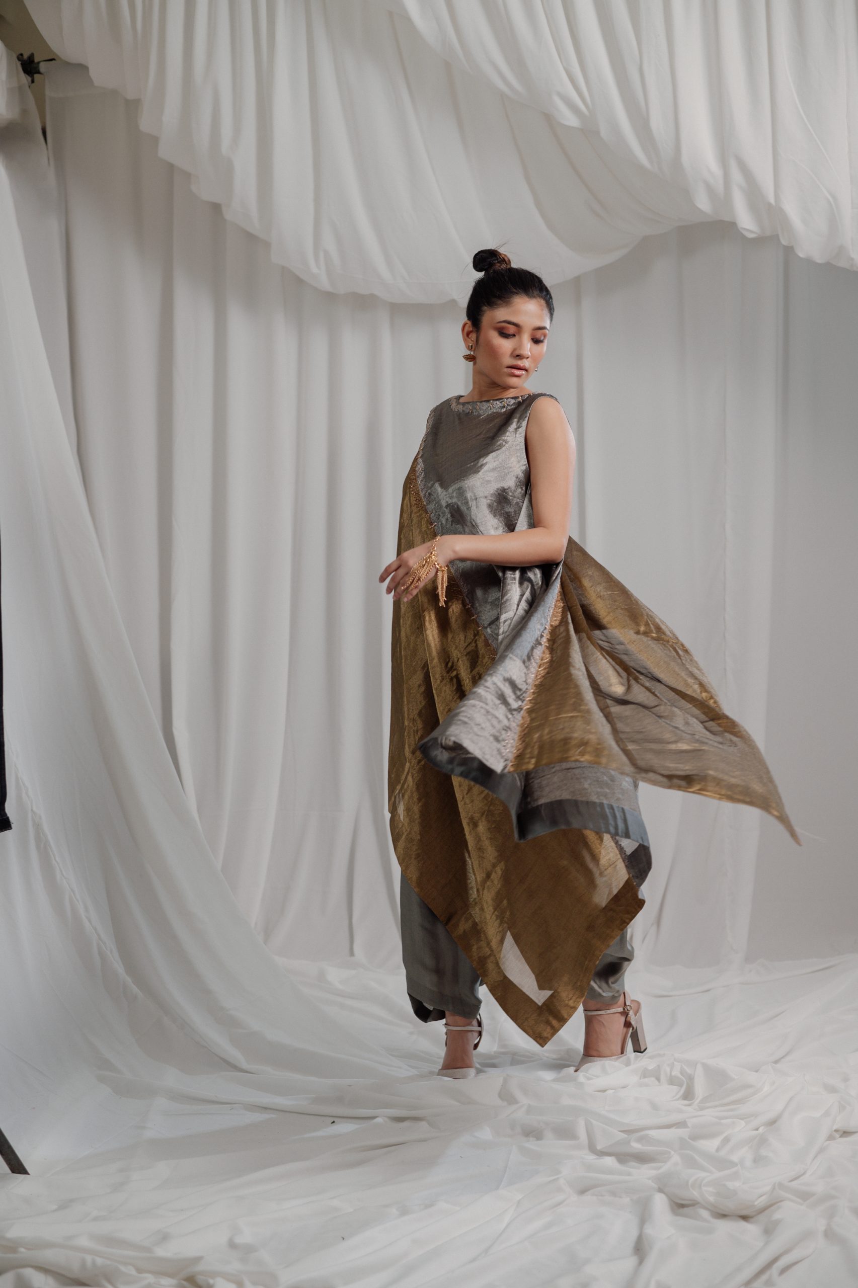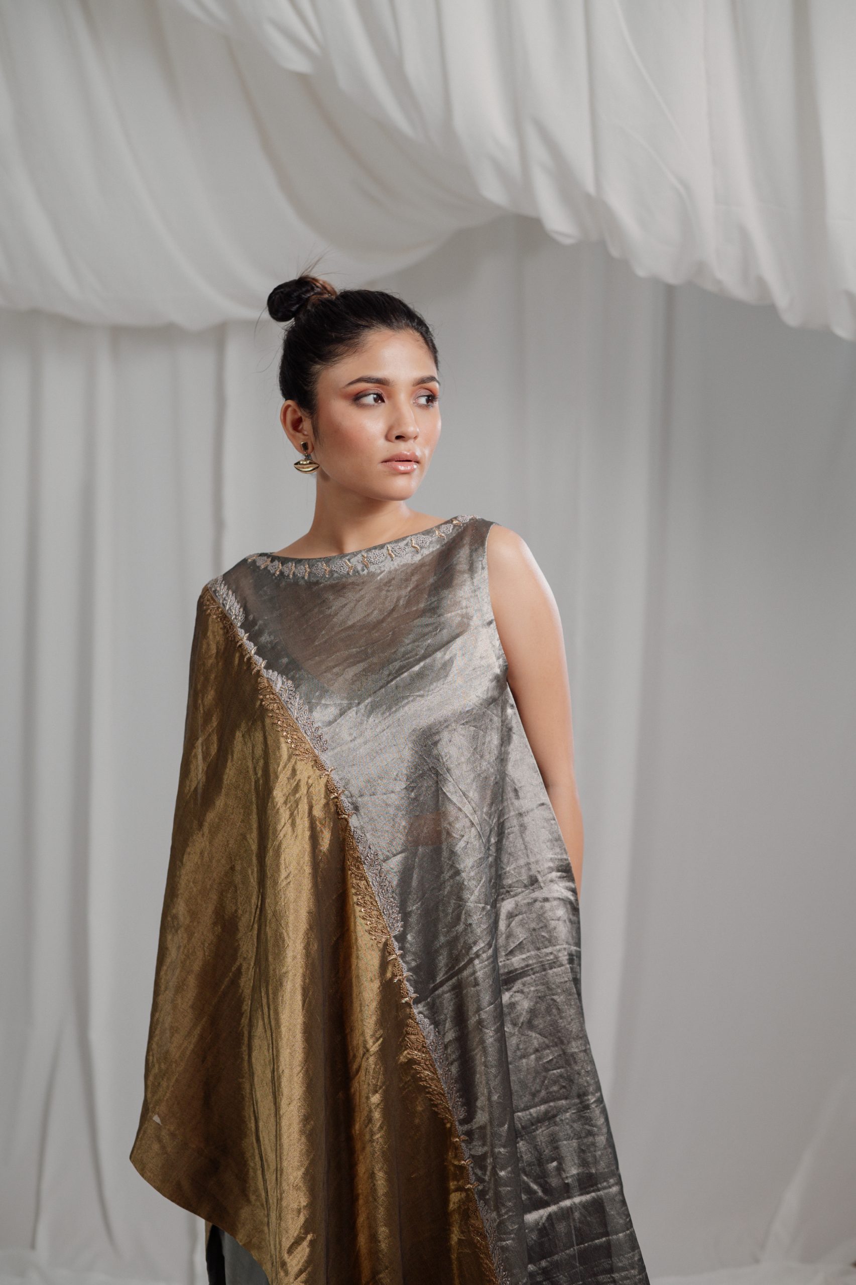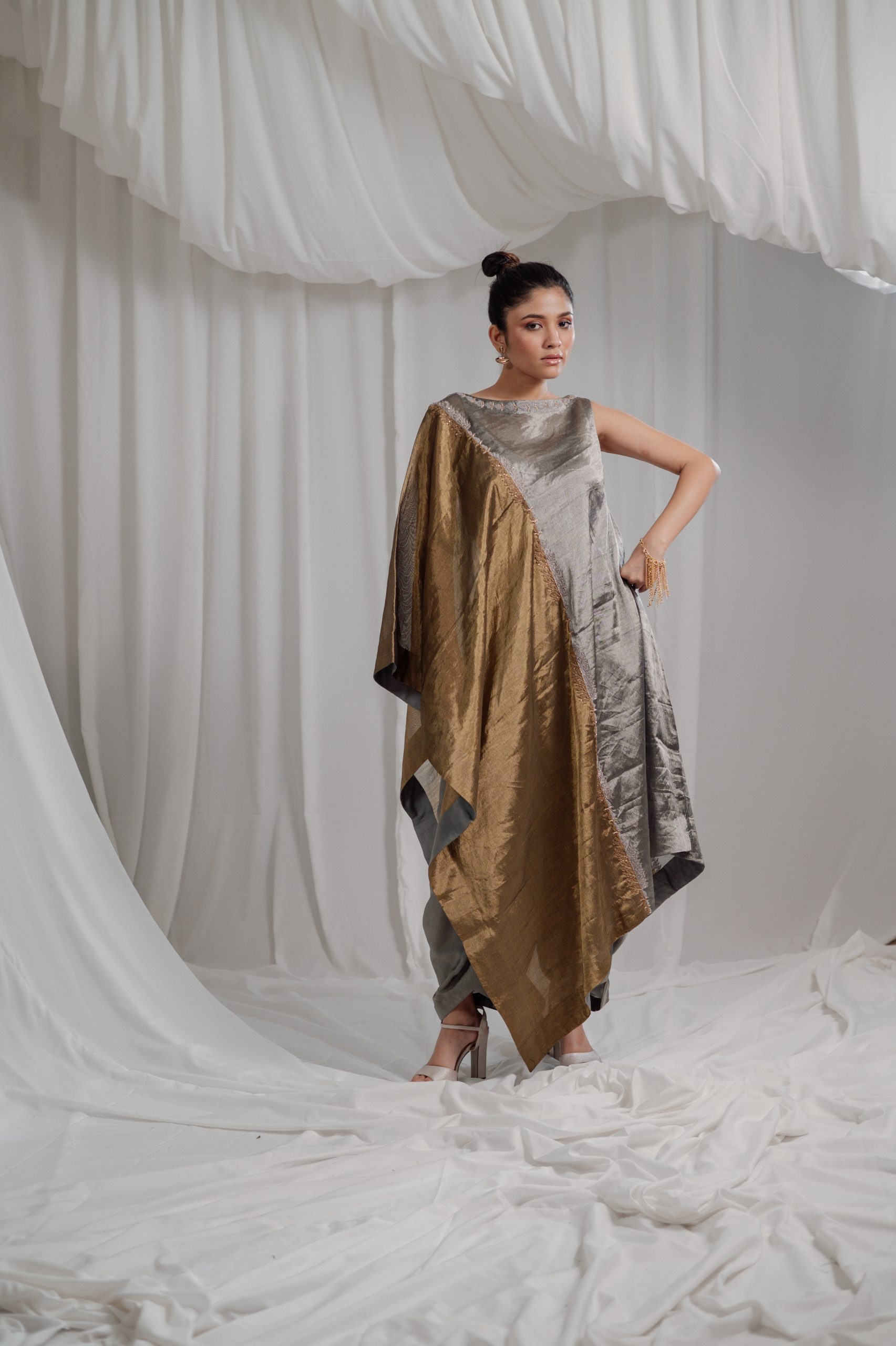 PURE HANDWOVEN TISSUE ASYMMETRIC TUNIC IN TONES OF VAULT AND METAL COMES WITH A COWL PANTS AND A BUSTIER. THE GREY AND GOLD EMROIDERY ENRICHES THE DESIGN and makes it a PERFECT OCCASION WEAR